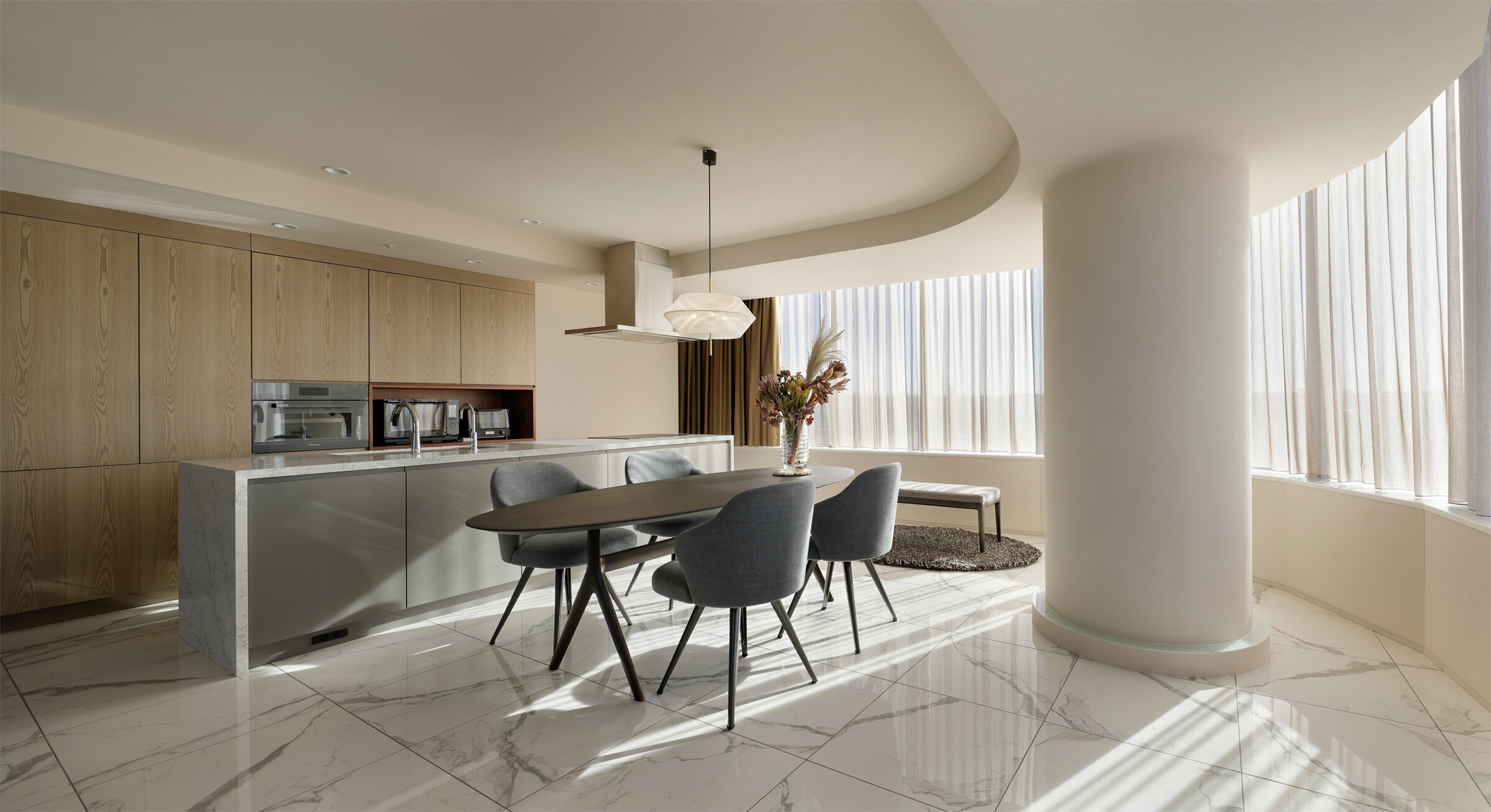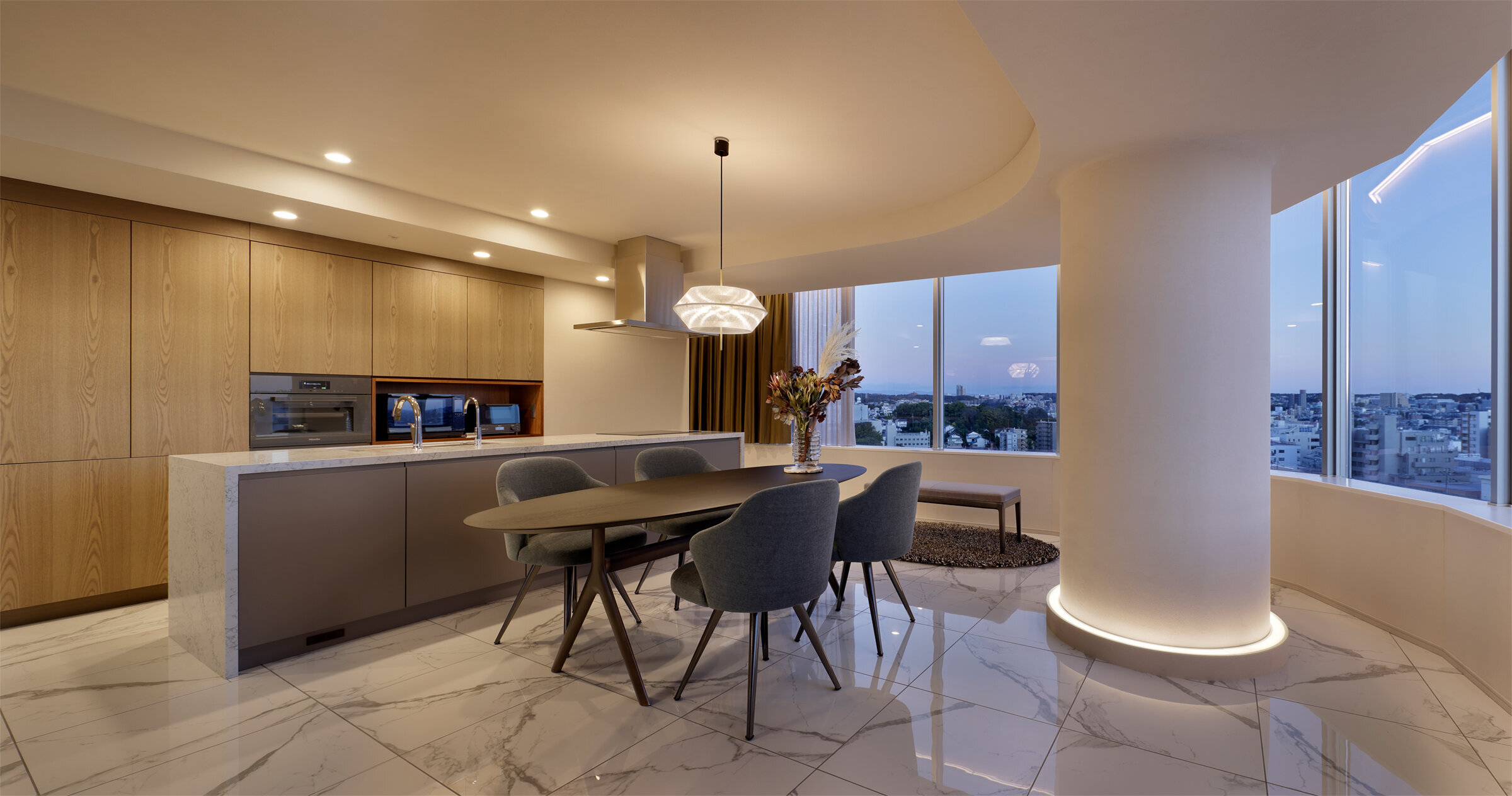 「天空の遺跡~Ruins of the sky」は、高台の高層マンションの窓から見える突き抜ける様な青空と時間の経過による丸みが醸し出す柔らかな石創りの表情をコンセプトにデザインされました。