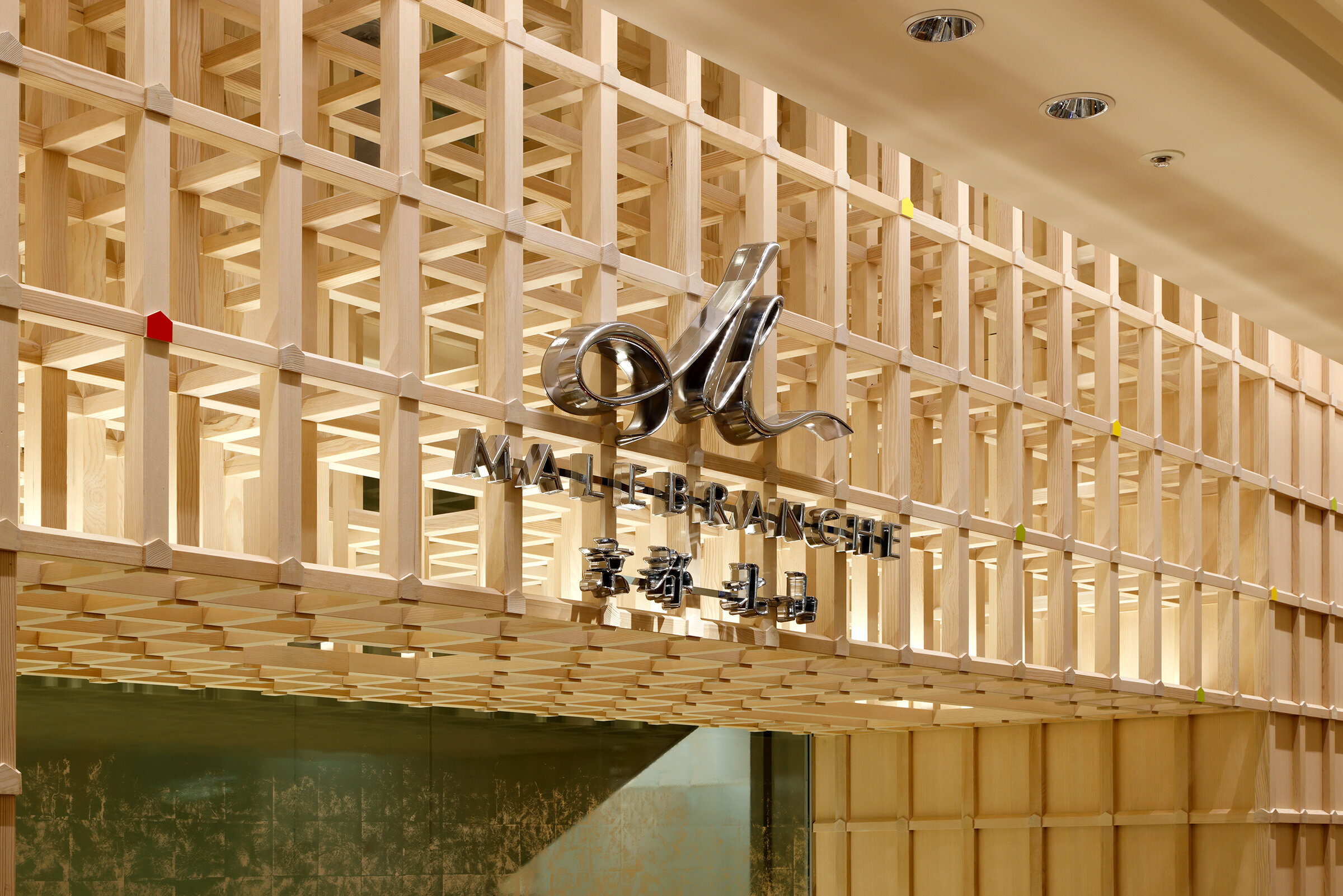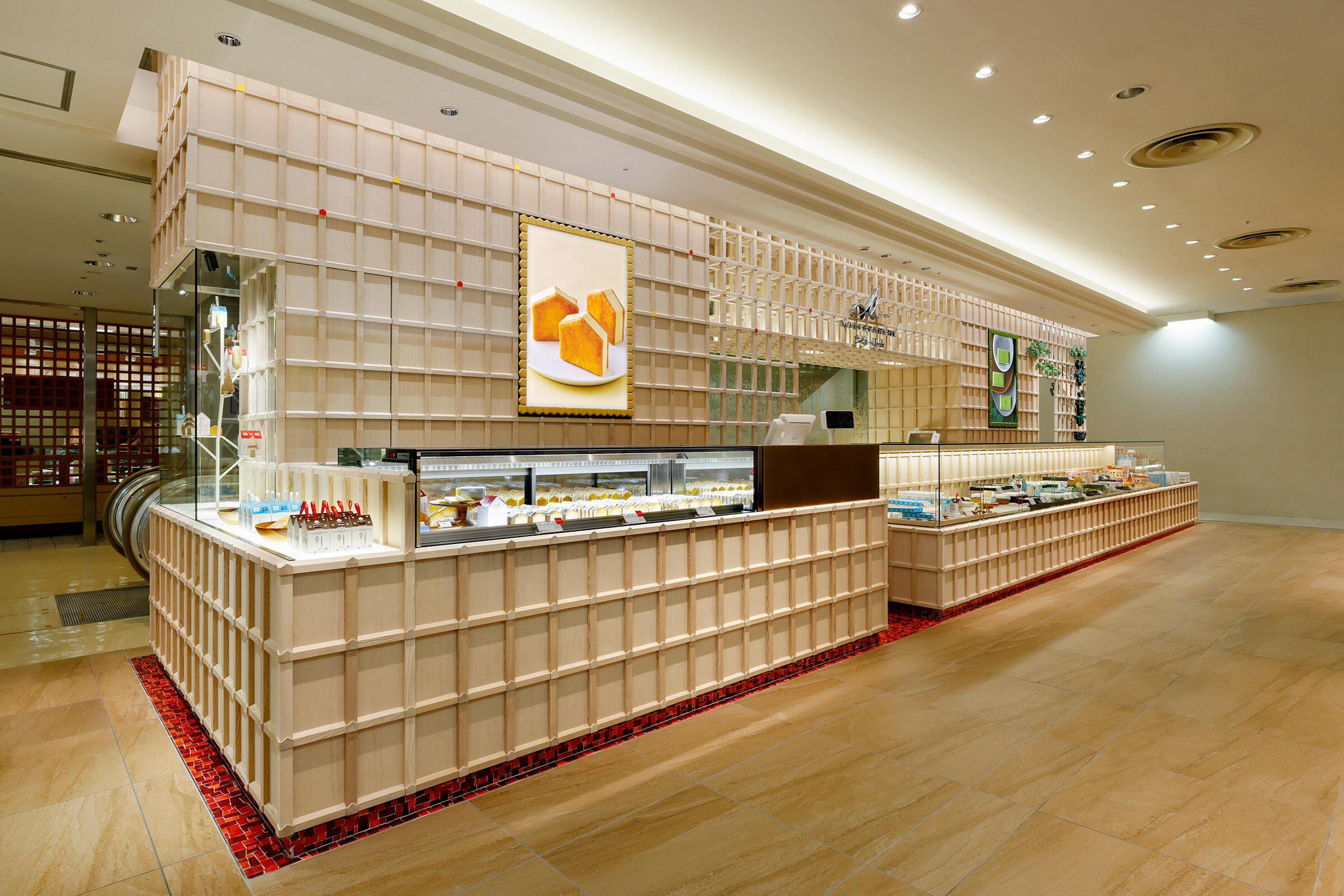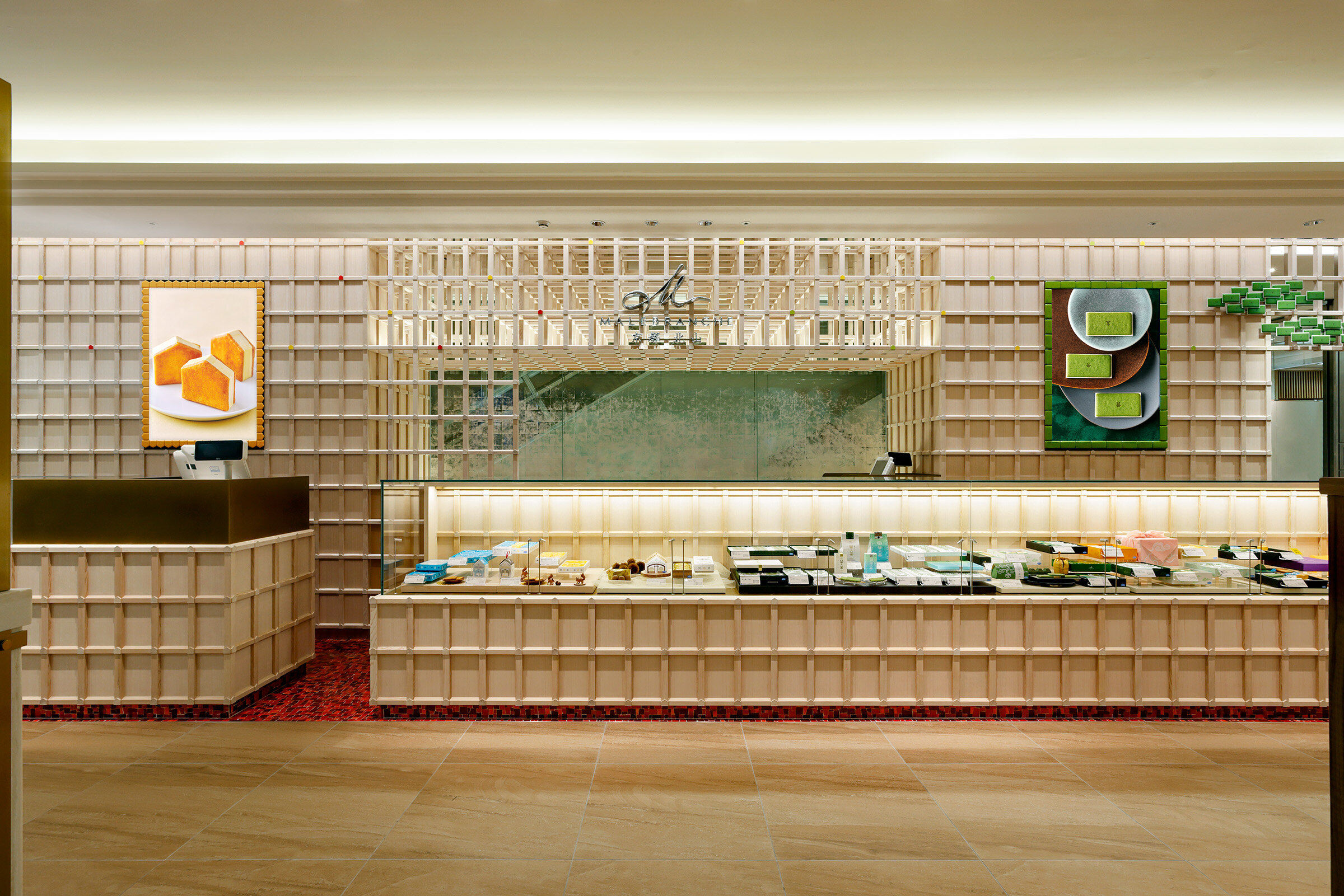 「朱漆の箱」のconceptによるマールブランシュのブランドカラーを全面に打ち出した空間→ マールブランシュのブランドカラーに包まれた空間。