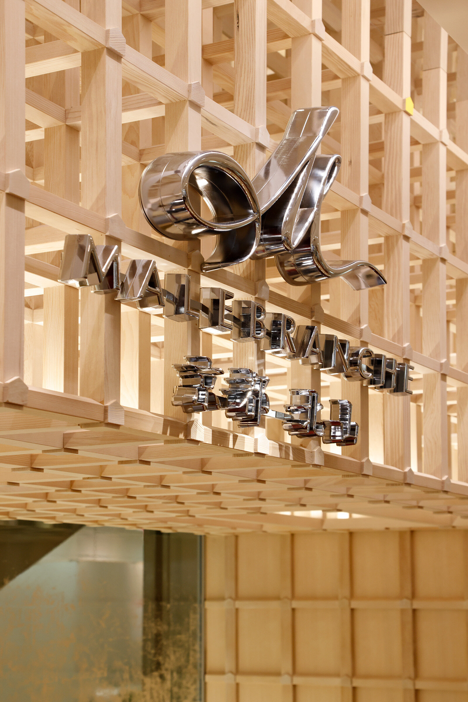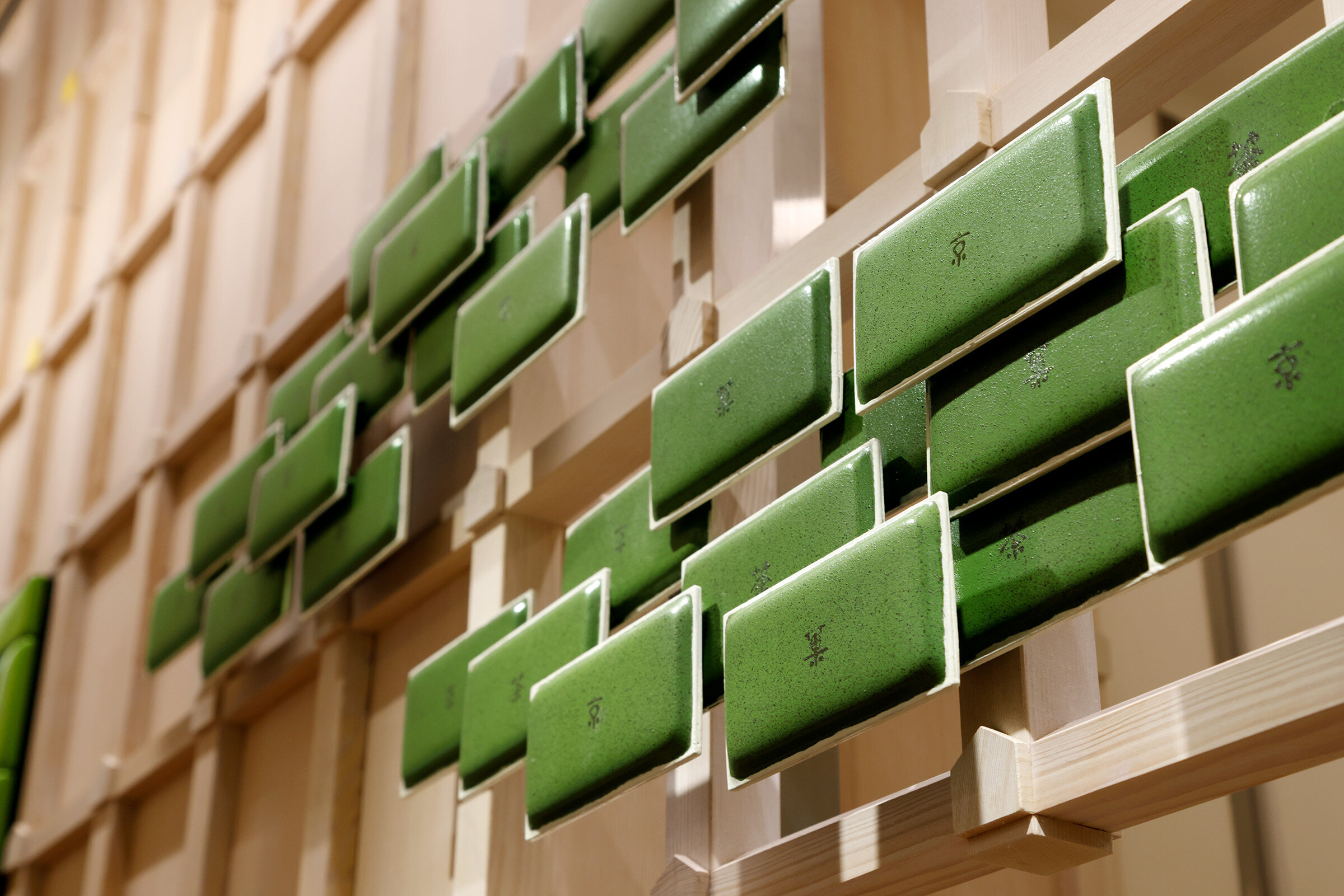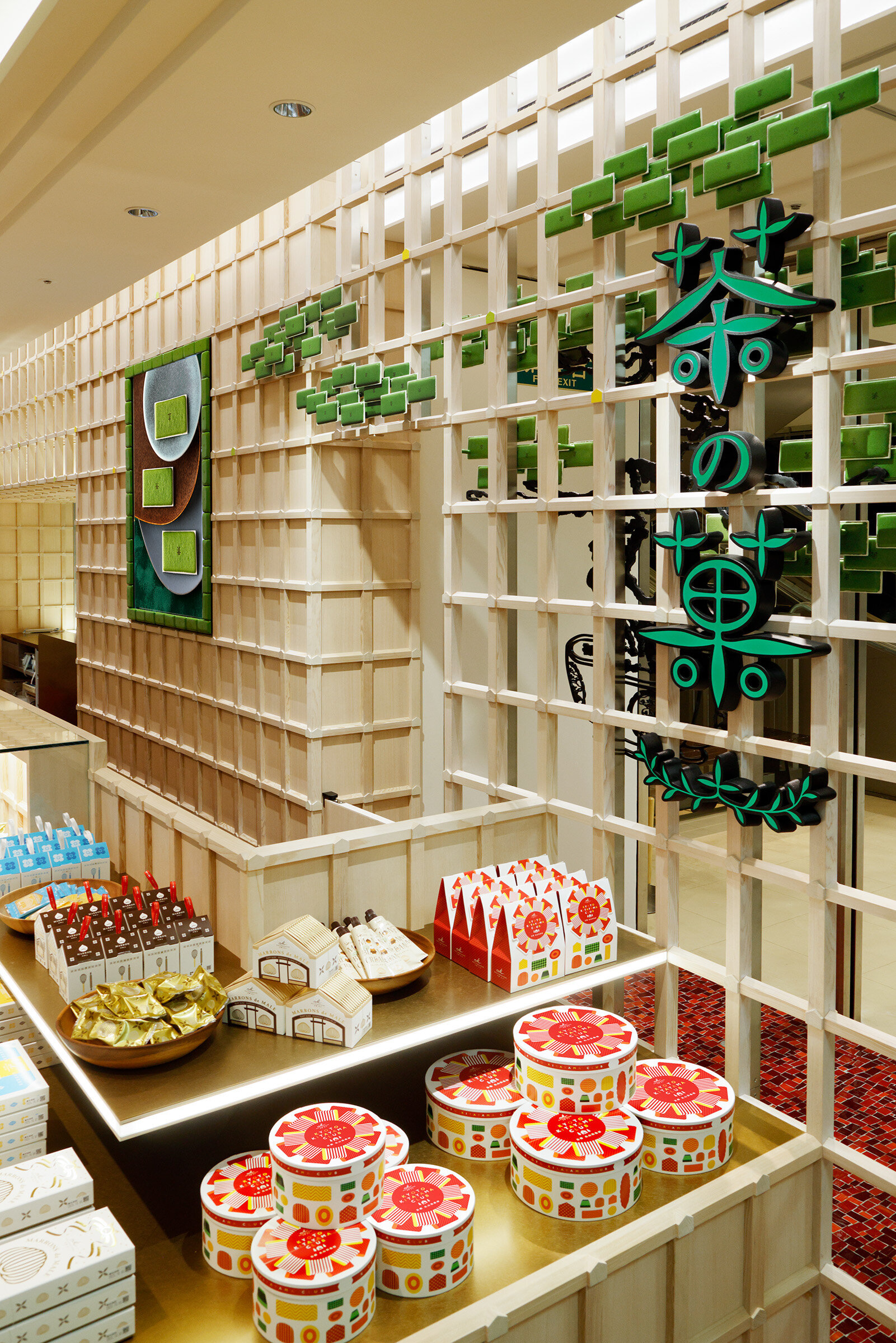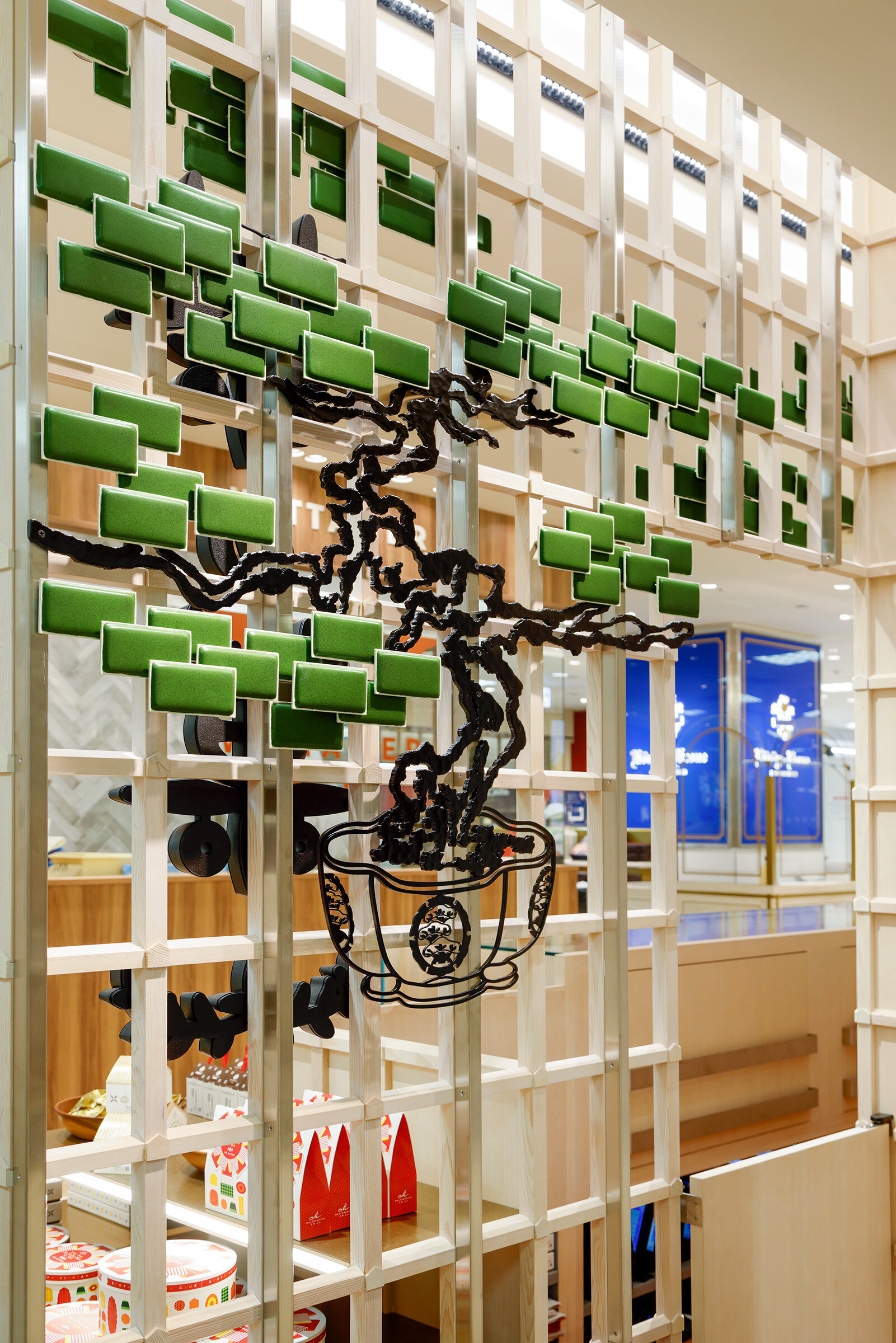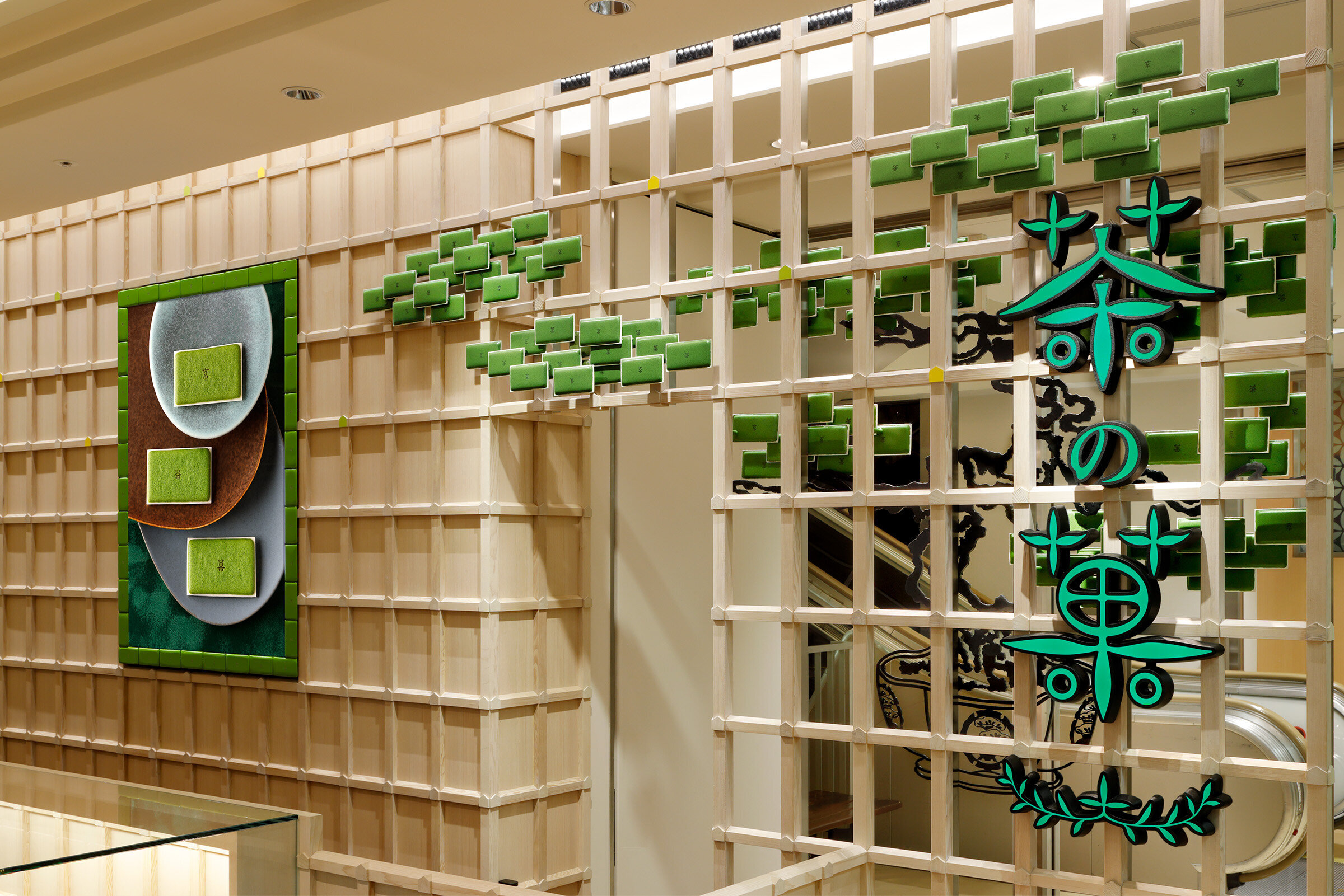 一目でわかる茶の菓ショップのアイコン「立体的な墨絵、茶の菓松」が木組みに見え隠れする。
