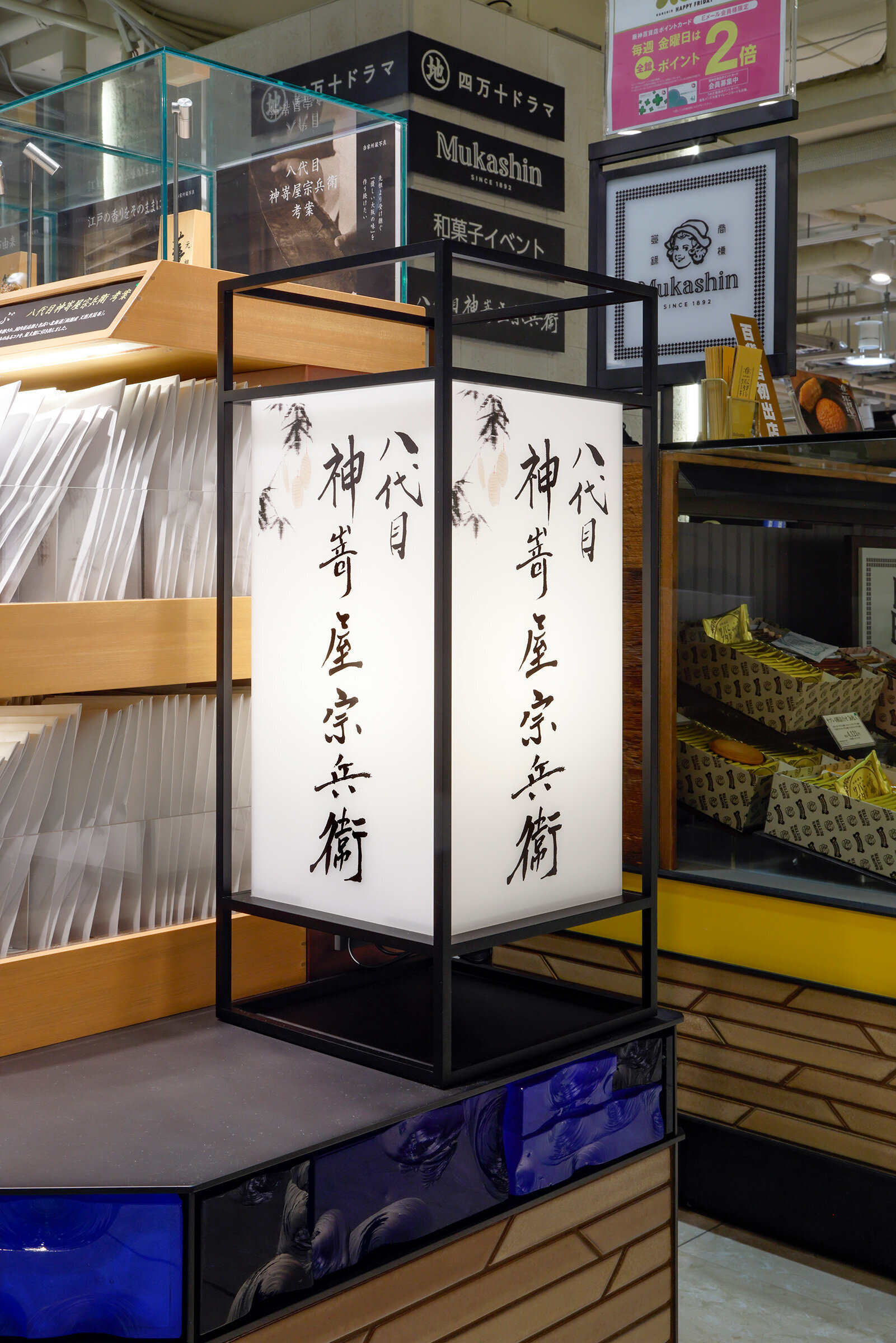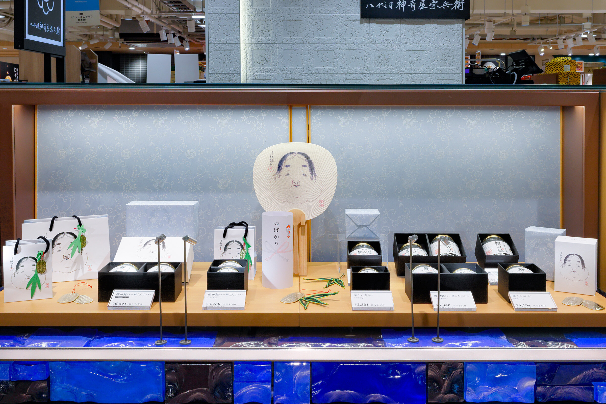 縁起物の笹に小判を背景にした「神嵜屋宗兵衛商店」の長のれんを道行き行燈にして、お多福の図柄の羽織を模したユニホームの従業員がお迎えします。